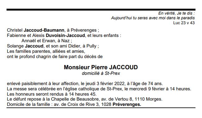 Monsieur Pierre JACCOUD 19 oct. 1947 - 03 fév. 2022 Avis mortuaire PFG Télecharger PDF Partager sur: Galerie PreviousNext PreviousNext
