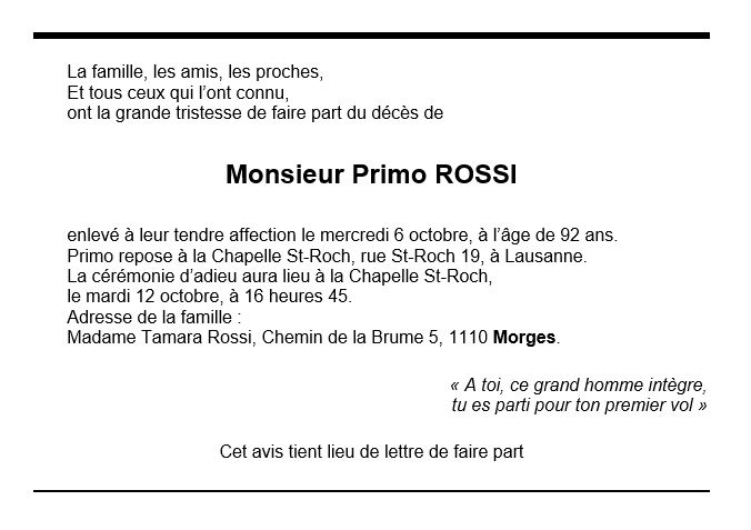 Monsieur Primo ROSSI 28 aoû. 1929 - 06 oct. 2021 Avis mortuaire PFG Télecharger PDF Partager sur: Galerie PreviousNext PreviousNext