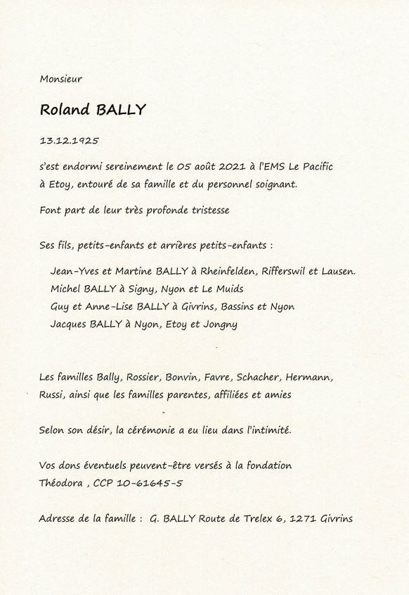 Monsieur Roland BALLY 13 déc. 1925 - 05 aoû. 2021 Avis mortuaire PFG Télecharger PDF Partager sur: Galerie PreviousNext PreviousNext