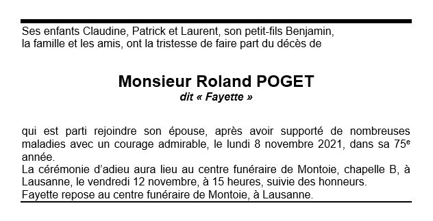 Monsieur Roland POGET 20 fév. 1947 - 08 nov. 2021 Avis mortuaire PFG Télecharger PDF Partager sur: Galerie PreviousNext PreviousNext