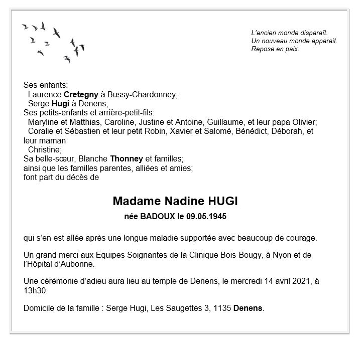 Nadine HUGI 09 mai. 1945 - 09 avr. 2021 Avis mortuaire PFG Télecharger PDF Partager sur: Galerie PreviousNext PreviousNext