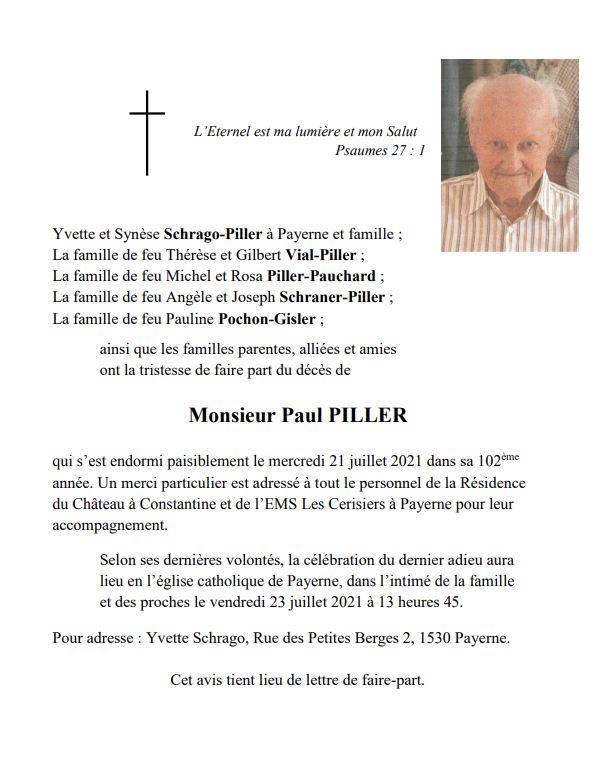Paul PILLER 17 mar. 1920 - 21 juil. 2021 Avis mortuaire PFG Télecharger PDF Partager sur: Galerie PreviousNext PreviousNext