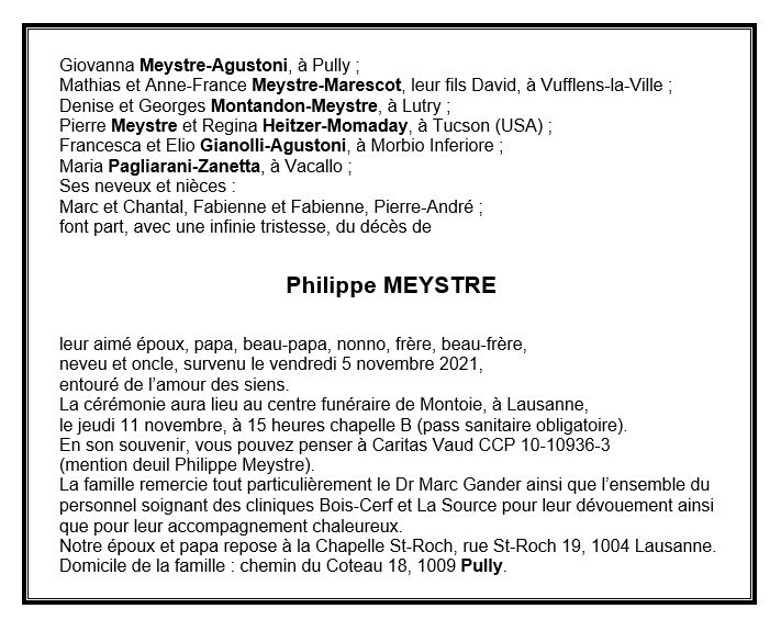 Philippe MEYSTRE 26 mar. 1947 - 05 nov. 2021 Avis mortuaire PFG Télecharger PDF Partager sur: Galerie PreviousNext PreviousNext