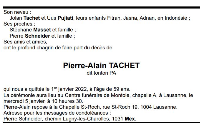 Pierre-Alain TACHET 11 aoû. 1962 - 01 jan. 2022 Avis mortuaire PFG Télecharger PDF Partager sur: Galerie PreviousNext PreviousNext