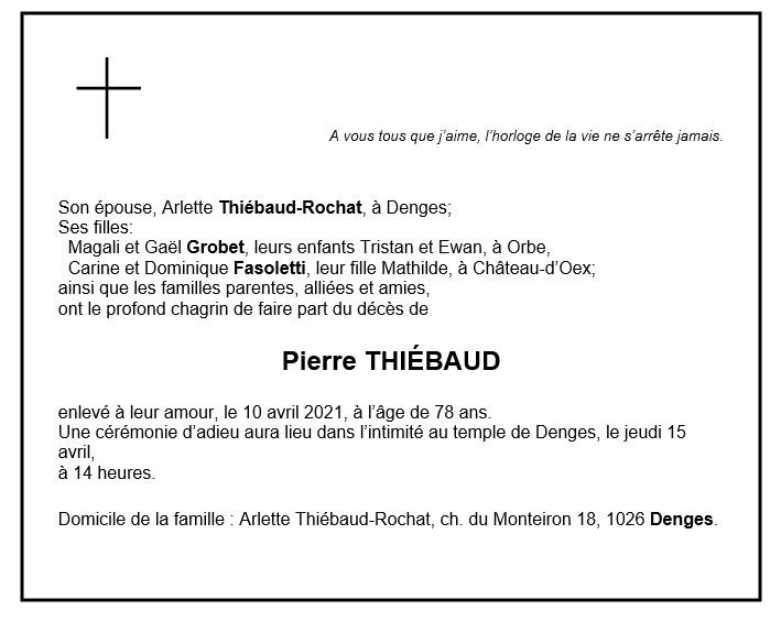 Pierre THIEBAUD 24 fév. 1943 - 10 avr. 2021 Avis mortuaire PFG Télecharger PDF Partager sur: Galerie PreviousNext PreviousNext
