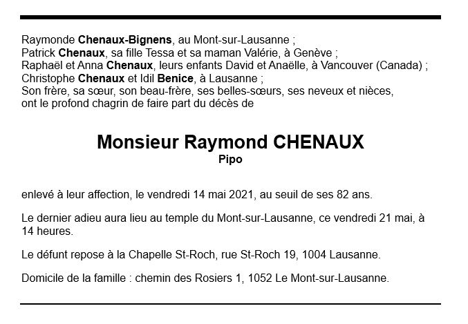 Raymond CHENAUX 20 juin. 1939 - 14 mai. 2021 Avis mortuaire PFG Télecharger PDF Partager sur: Galerie PreviousNext PreviousNext