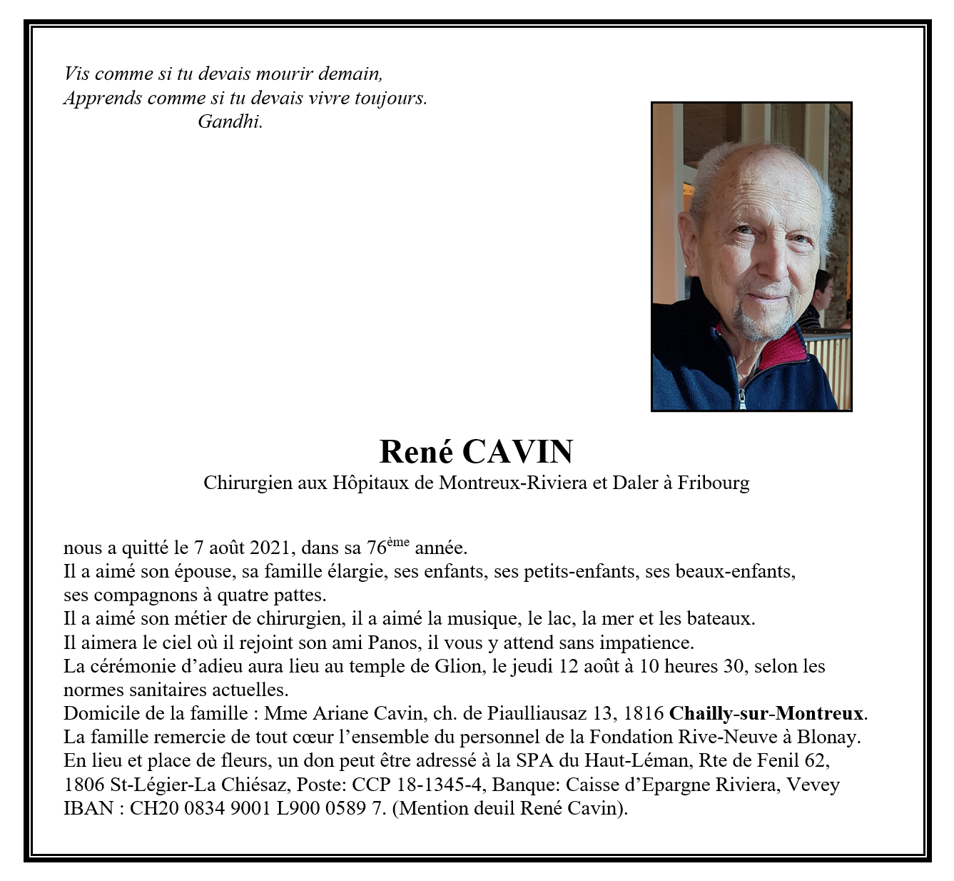René CAVIN 20 oct. 1945 - 07 aoû. 2021 Avis mortuaire PFG Télecharger PDF Partager sur: Galerie PreviousNext PreviousNext