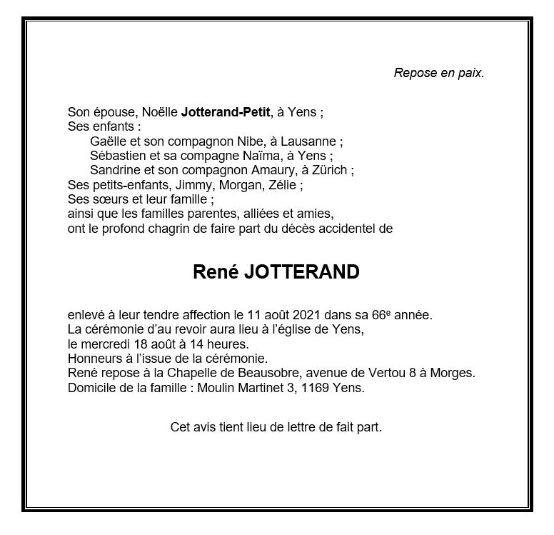 René JOTTERAND 08 oct. 1955 - 11 aoû. 2021 Avis mortuaire PFG Télecharger PDF Partager sur: Galerie PreviousNext PreviousNext