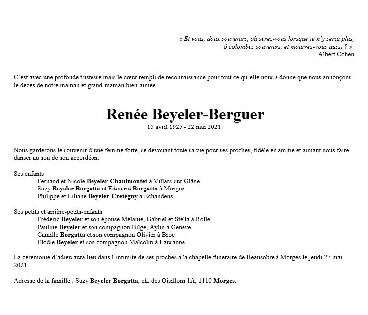 Renée BEYELER-BERGUER 15 avr. 1925 - 22 mai. 2021 Avis mortuaire PFG Télecharger PDF Partager sur: Galerie PreviousNext PreviousNext