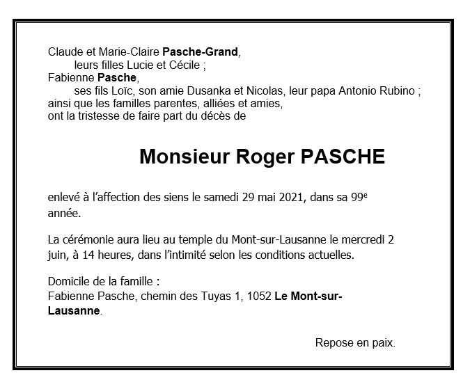Roger PASCHE 21 oct. 1922 - 29 mai. 2021 Avis mortuaire PFG Télecharger PDF Partager sur: Galerie PreviousNext PreviousNext