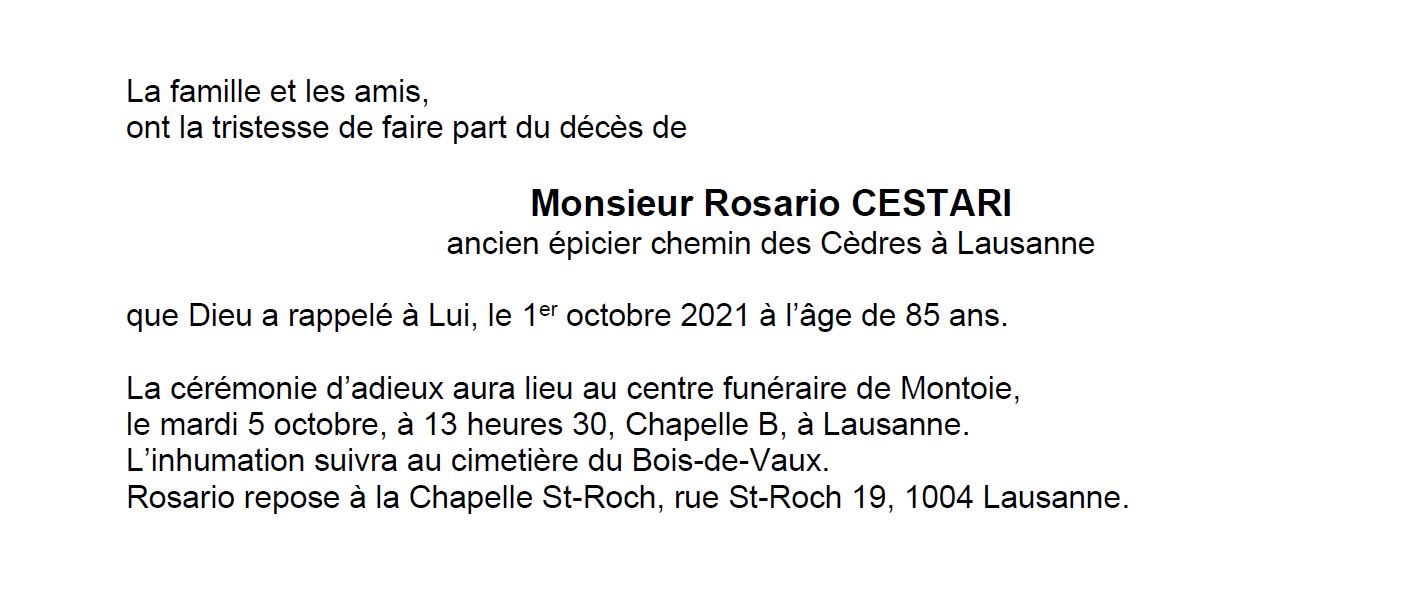 Rosario Cestari 29 oct. 1935 - 01 oct. 2021 Avis mortuaire PFG Télecharger PDF Partager sur: Galerie PreviousNext PreviousNext