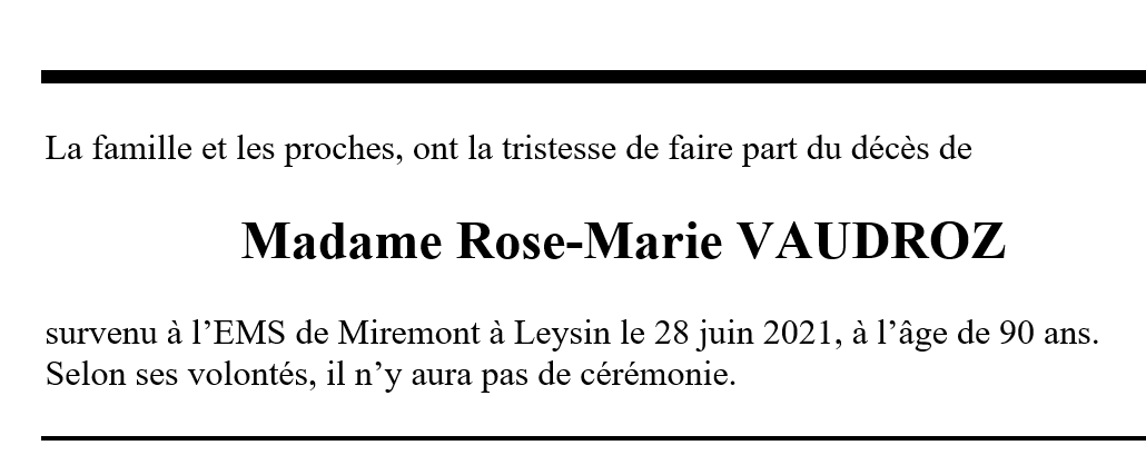Rose-Marie VAUDROZ 07 juin. 1931 - 28 juin. 2021 Avis mortuaire PFG Télecharger PDF Partager sur: Galerie PreviousNext PreviousNext