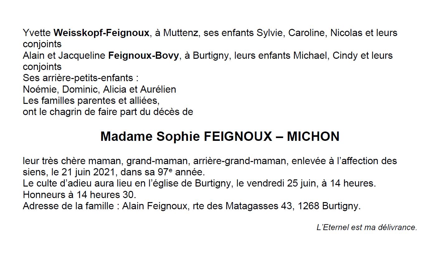 Sophie FEIGNOUX – MICHON 18 fév. 1924 - 21 juin. 2021 Avis mortuaire PFG Télecharger PDF Partager sur: Galerie PreviousNext PreviousNext