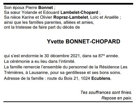 Yvette BONNET-CHOPARD 03 juil. 1935 - 30 déc. 2021 Avis mortuaire PFG Télecharger PDF Partager sur: Galerie PreviousNext PreviousNext